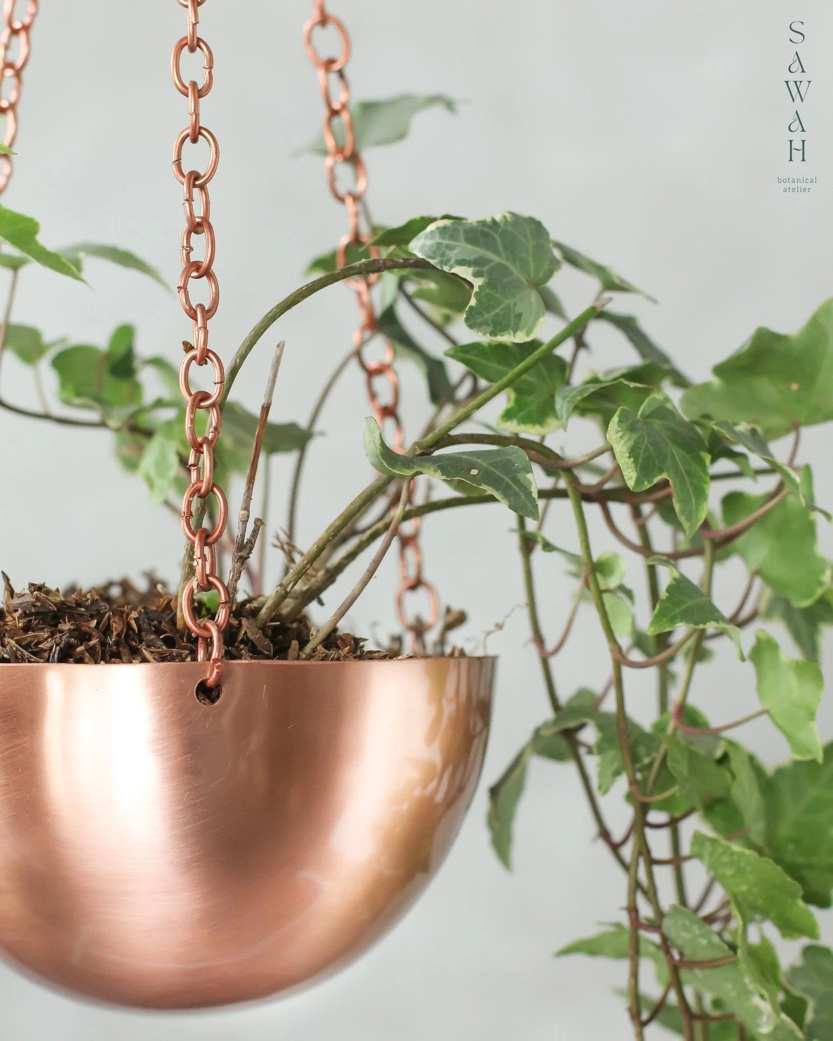 Go green with this super stylish metal planter . Features brushed copper look and triple-strand chain for hanging.This chic planter surely adds some modern accent and charm to your indoor space. Simply fill in with your favourite green and get hangging.