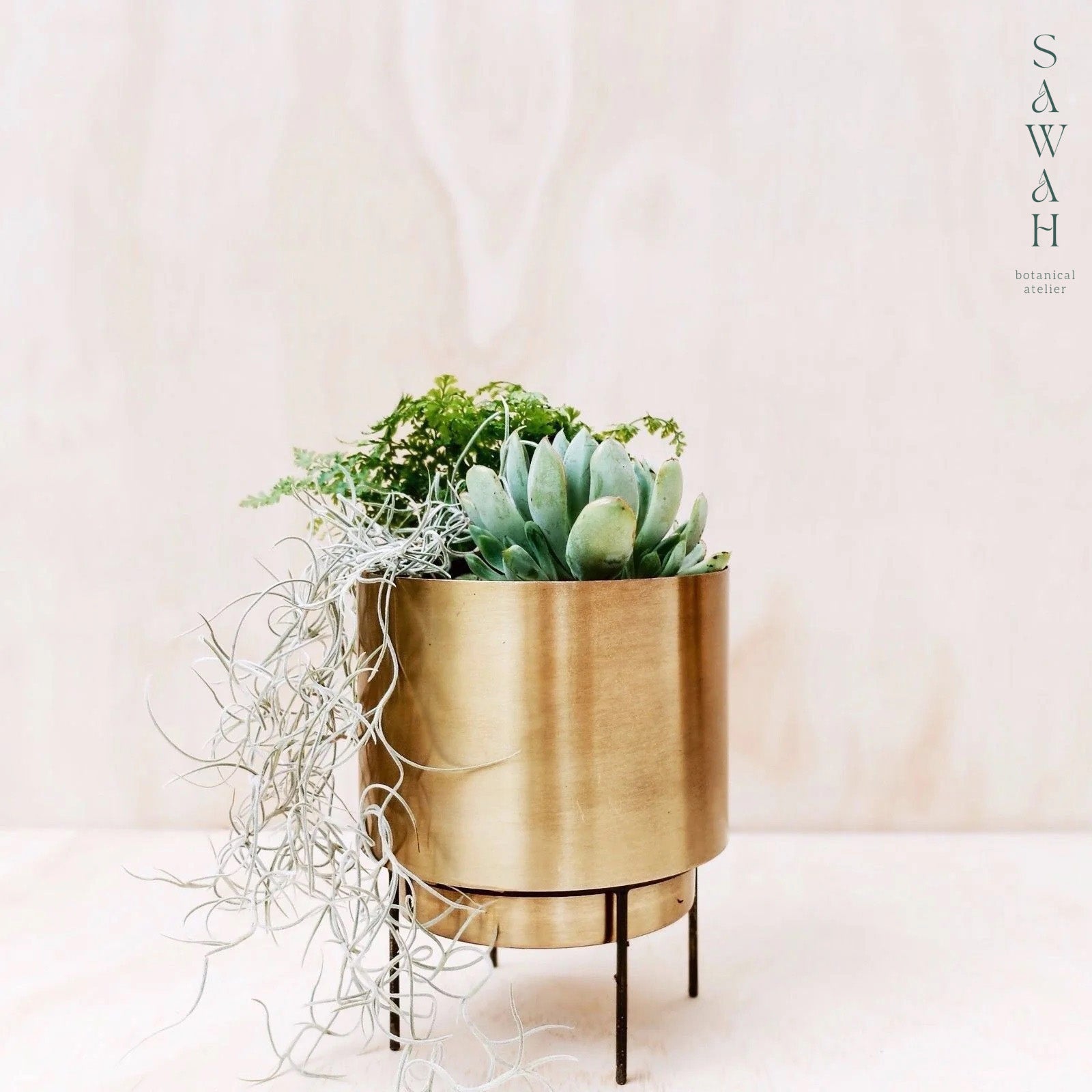 Add some green accent to your living space. Featuring a minimal cylindrical shape attached to mini metal stand. This chic metal planter surely adds some modern accent and charm to your indoor space. Perfect to host your succulent and cacti collection.